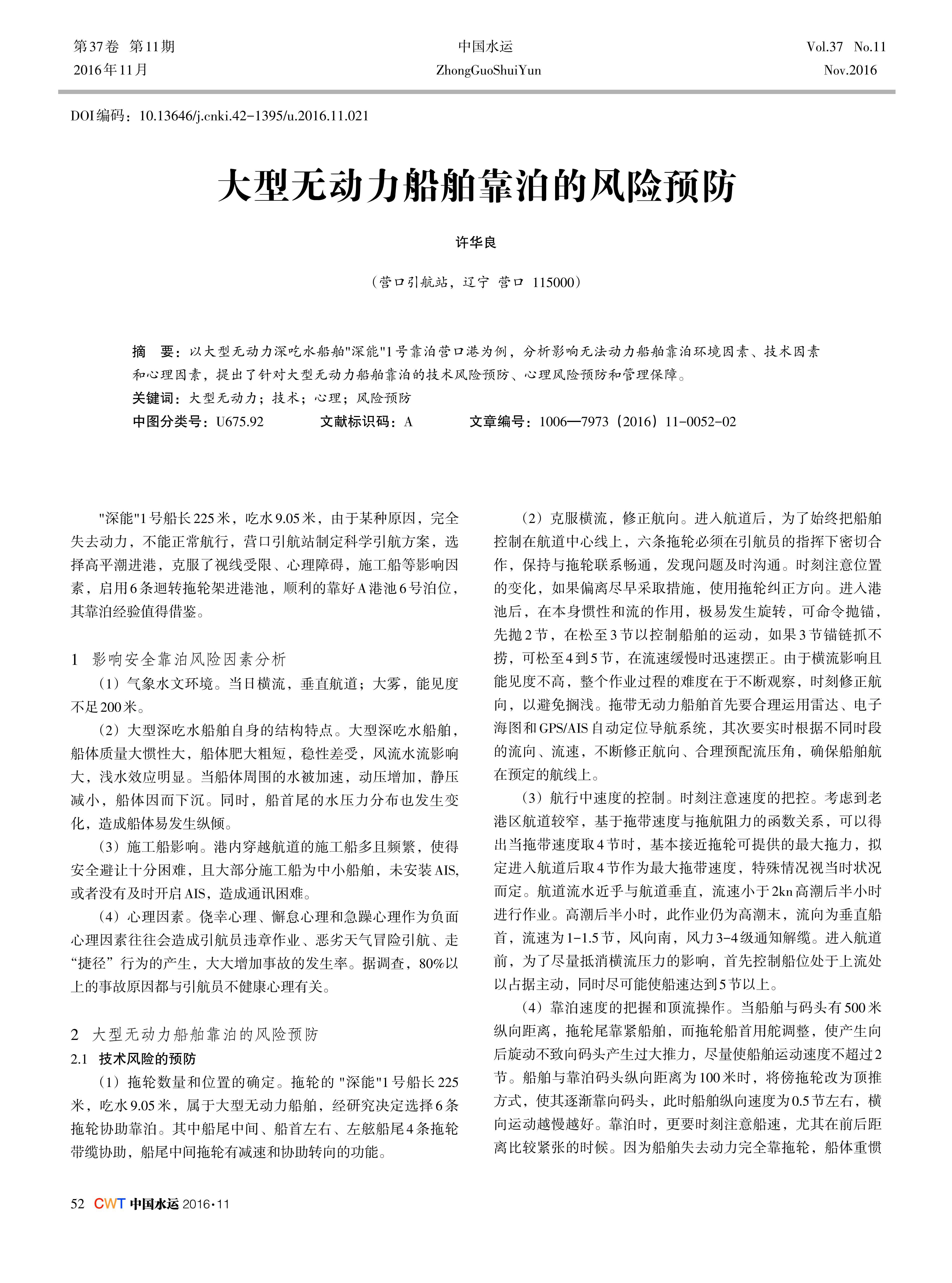 以大型无动力深吃水船舶"深能"1号靠泊营口港为例,分析影响无法动力船舶靠泊环境因素、技术因素 和心理因素,提出了针对大型无动力船舶靠泊的技术风险预防、心理风险预防和管理保障。