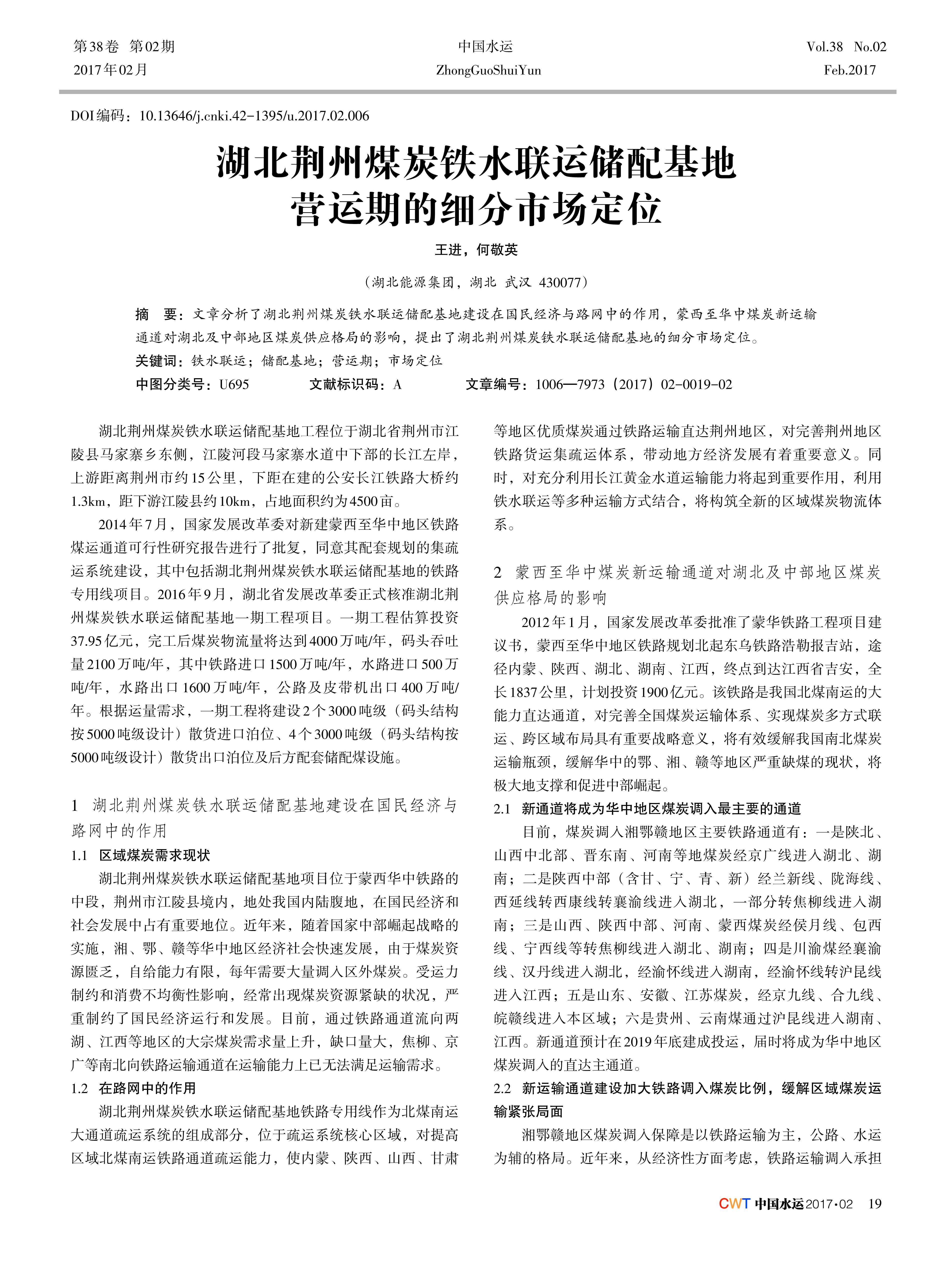 文章分析了湖北荆州煤炭铁水联运储配基地建设在国民经济与路网中的作用,蒙西至华中煤炭新运输 通道对湖北及中部地区煤炭供应格局的影响,提出了湖北荆州煤炭铁水联运储配基地的细分市场定位。