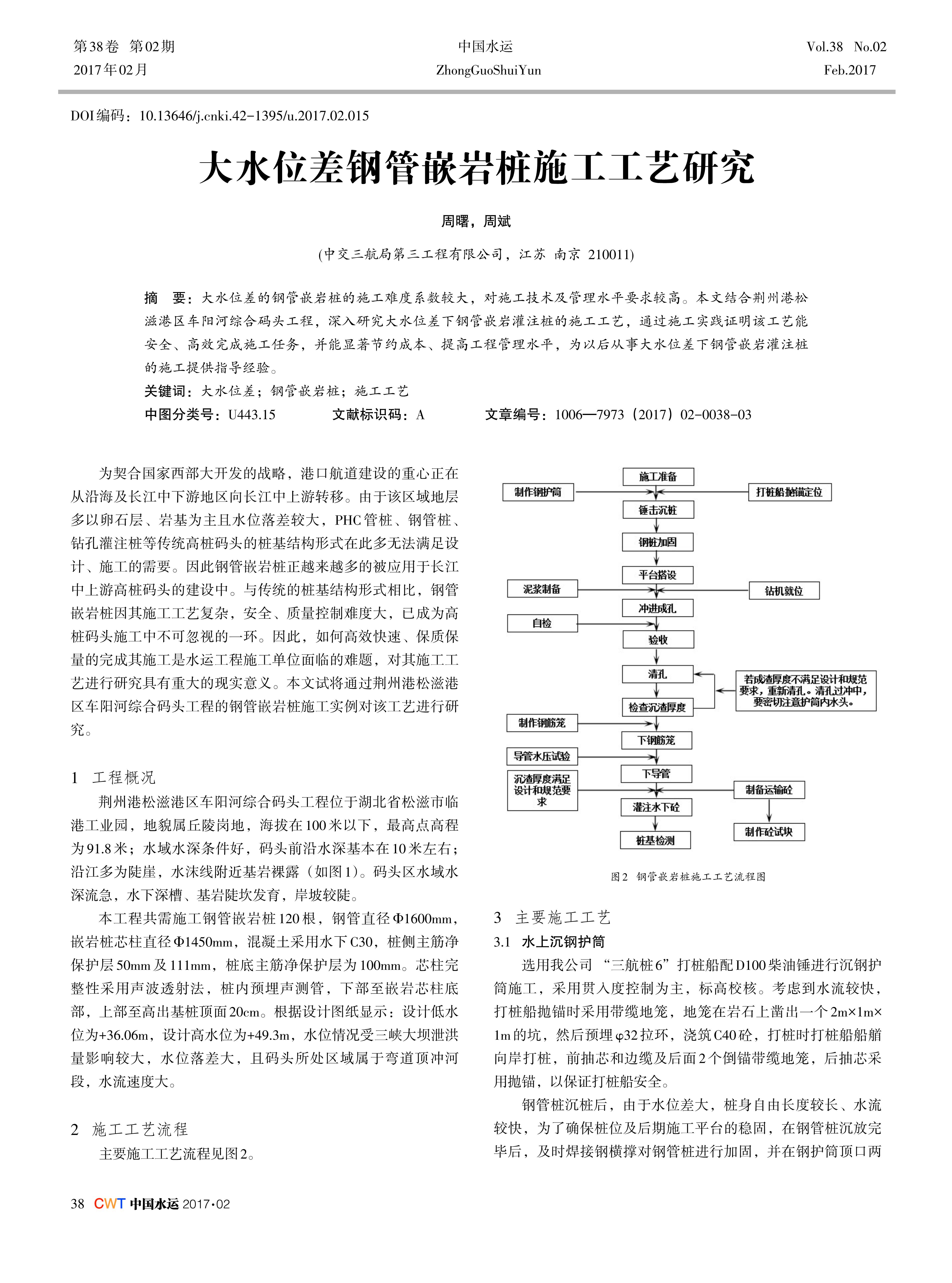 大水位差的钢管嵌岩桩的施工难度系数较大,对施工技术及管理水平要求较高。本文结合荆州港松 滋港区车阳河综合码头工程,深入研究大水位差下钢管嵌岩灌注桩的施工工艺,通过施工实践证明该工艺能 安全、高效完成施工任务,并能显著节约成本、提高工程管理水平,为以后从事大水位差下钢管嵌岩灌注桩 的施工提供指导经验。