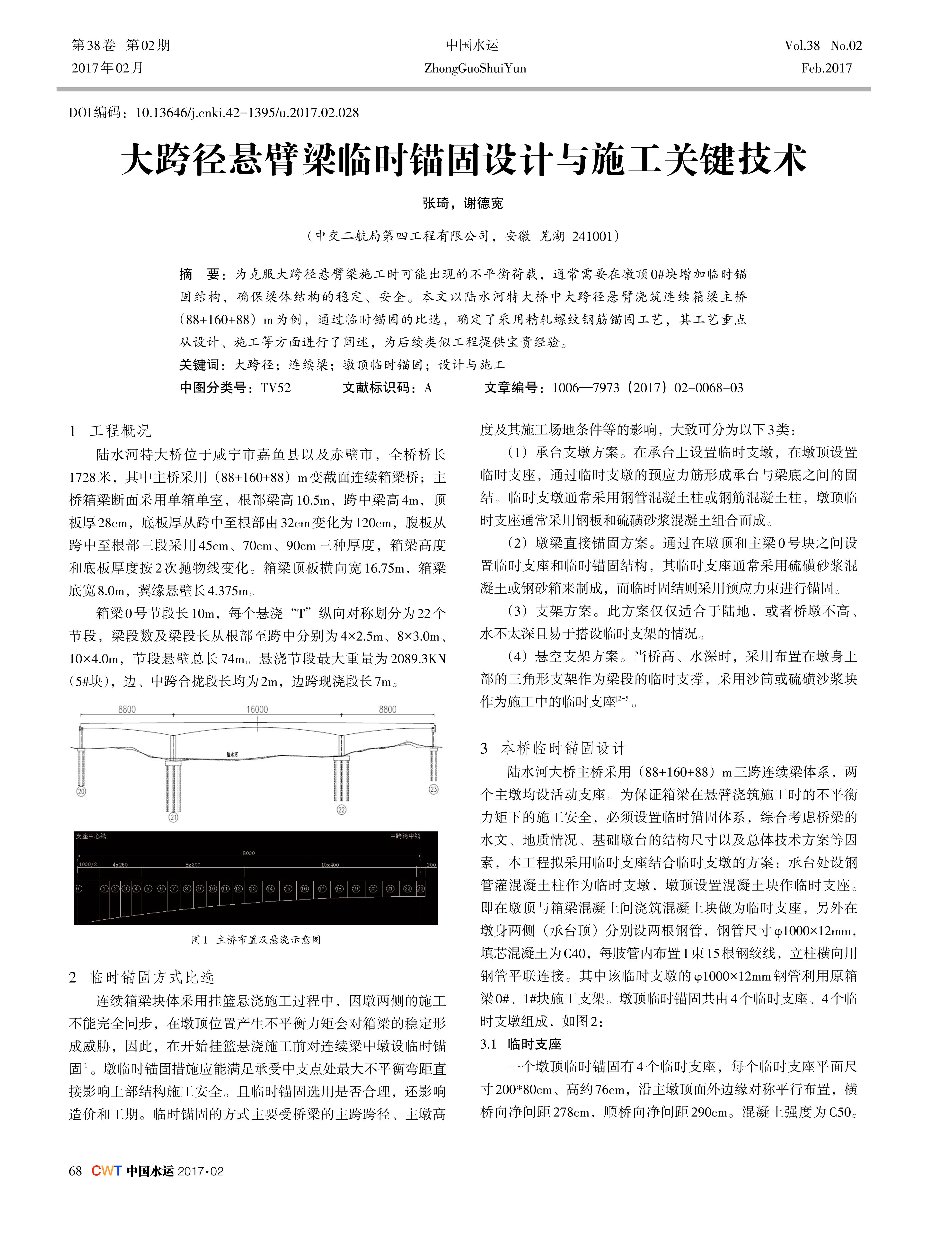 为克服大跨径悬臂梁施工时可能出现的不平衡荷载,通常需要在墩顶0#块增加临时锚 固结构,确保梁体结构的稳定、安全。本文以陆水河特大桥中大跨径悬臂浇筑连续箱梁主桥 (88+160+88) m为例,通过临时锚固的比选,确定了采用精轧螺纹钢筋锚固工艺,其工艺重点 从设计、施工等方面进行了阐述,为后续类似工程提供宝贵经验。