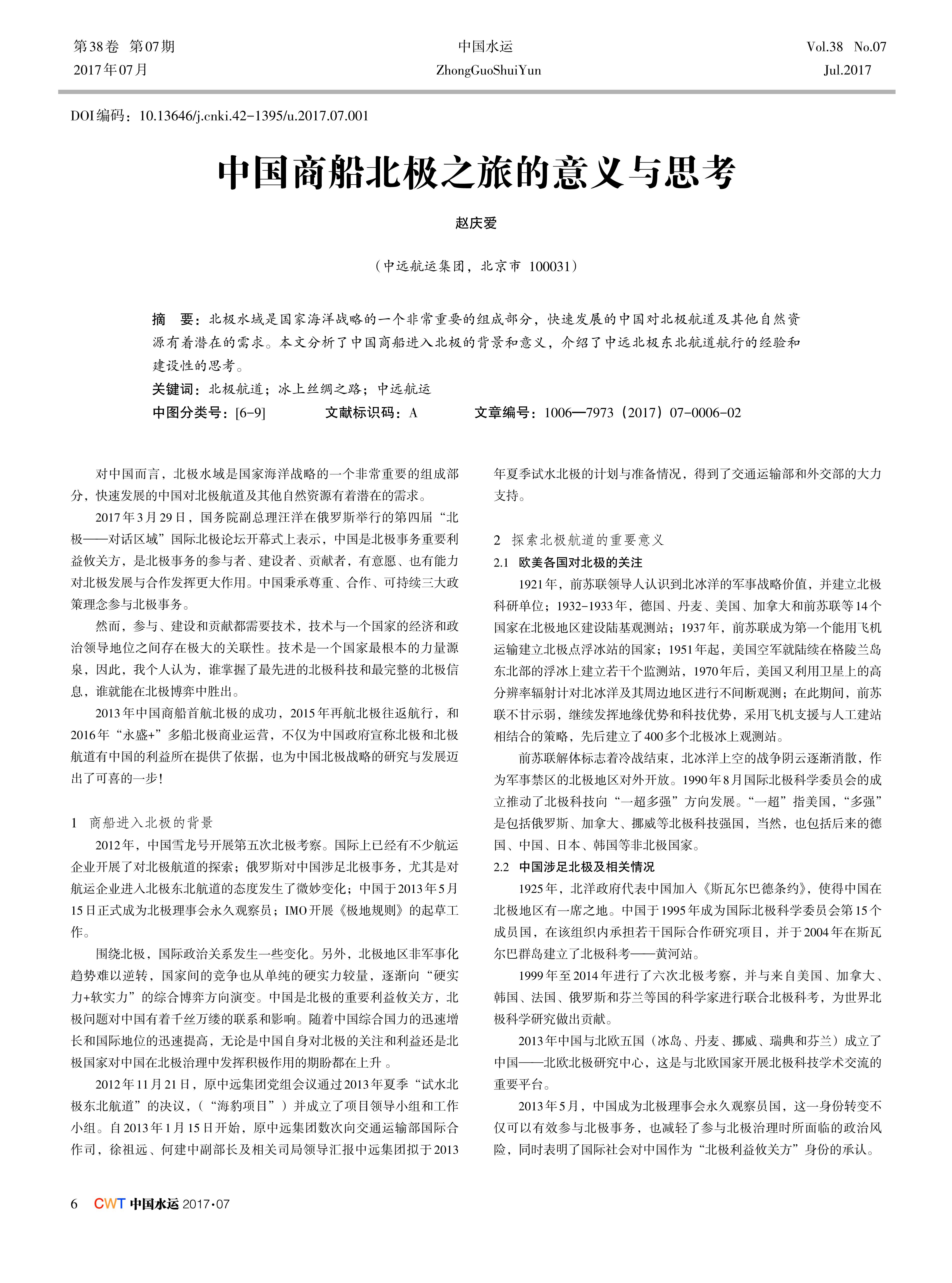 北极水域是国家海洋战略的一个非常重要的组成部分,快速发展的中国对北极航道及其他自然资 源有着潜在的需求。本文分析了中国商船进入北极的背景和意义,介绍了中远北极东北航道航行的经验和 建设性的思考。