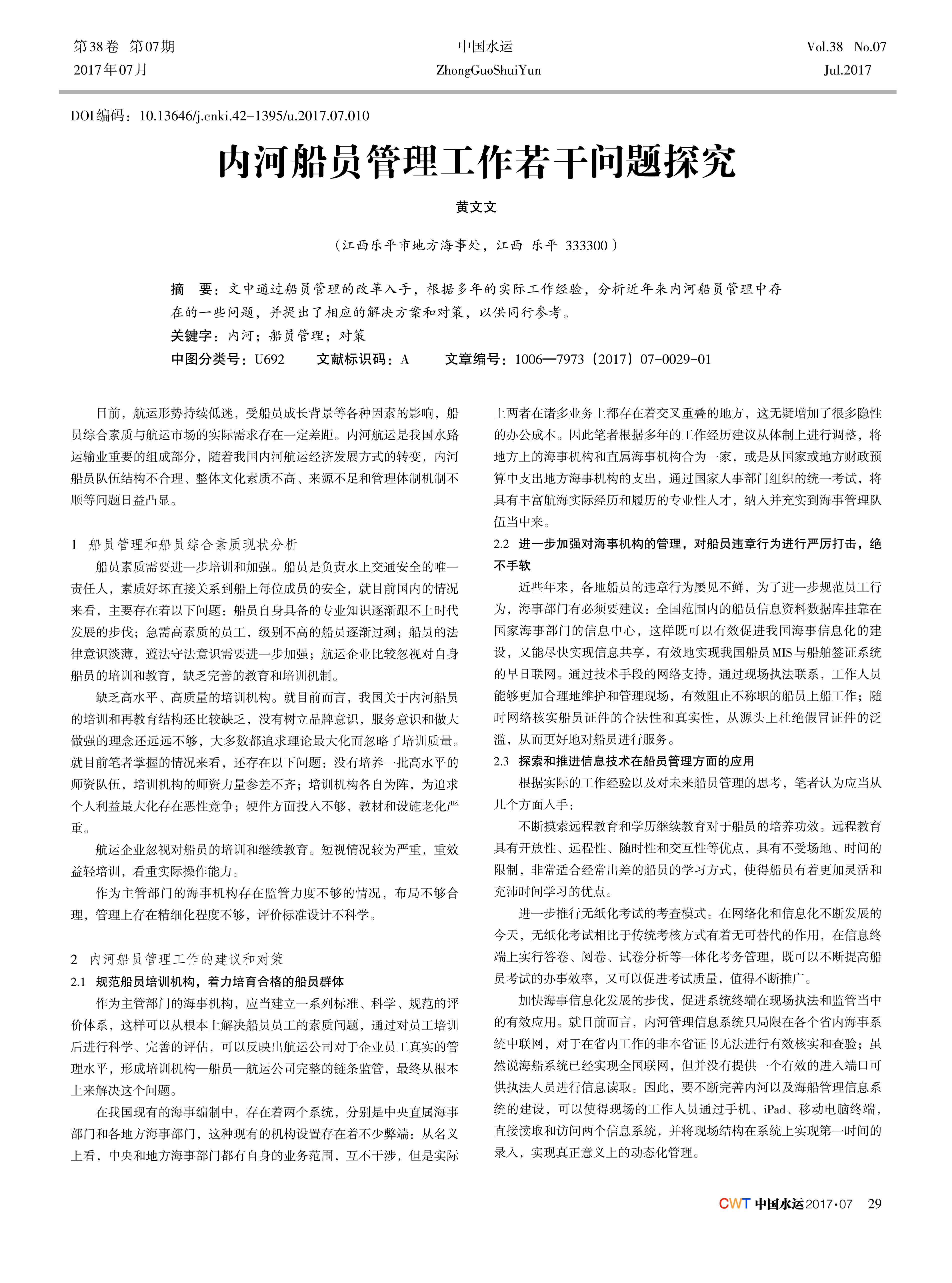 文中通过船员管理的改革入手,根据多年的实际工作经验,分析近年来内河船员管理中存 在的一些问题,并提出了相应的解决方案和对策,以供同行参考。