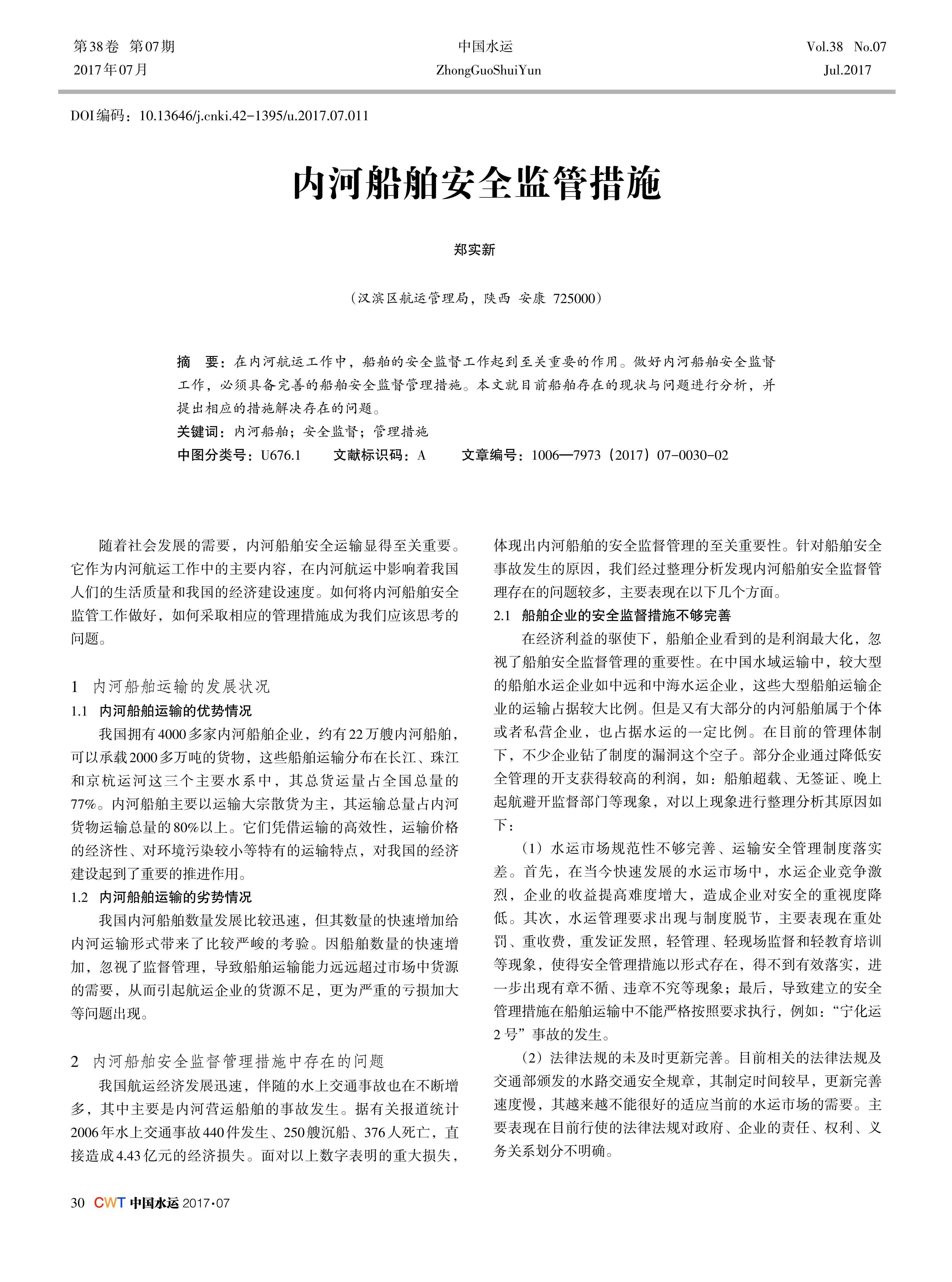 在内河航运工作中,船舶的安全监督工作起到至关重要的作用。做好内河船舶安全监督 工作,必须具备完善的船舶安全监督管理措施。本文就目前船舶存在的现状与问题进行分析,并 提出相应的措施解决存在的问题。