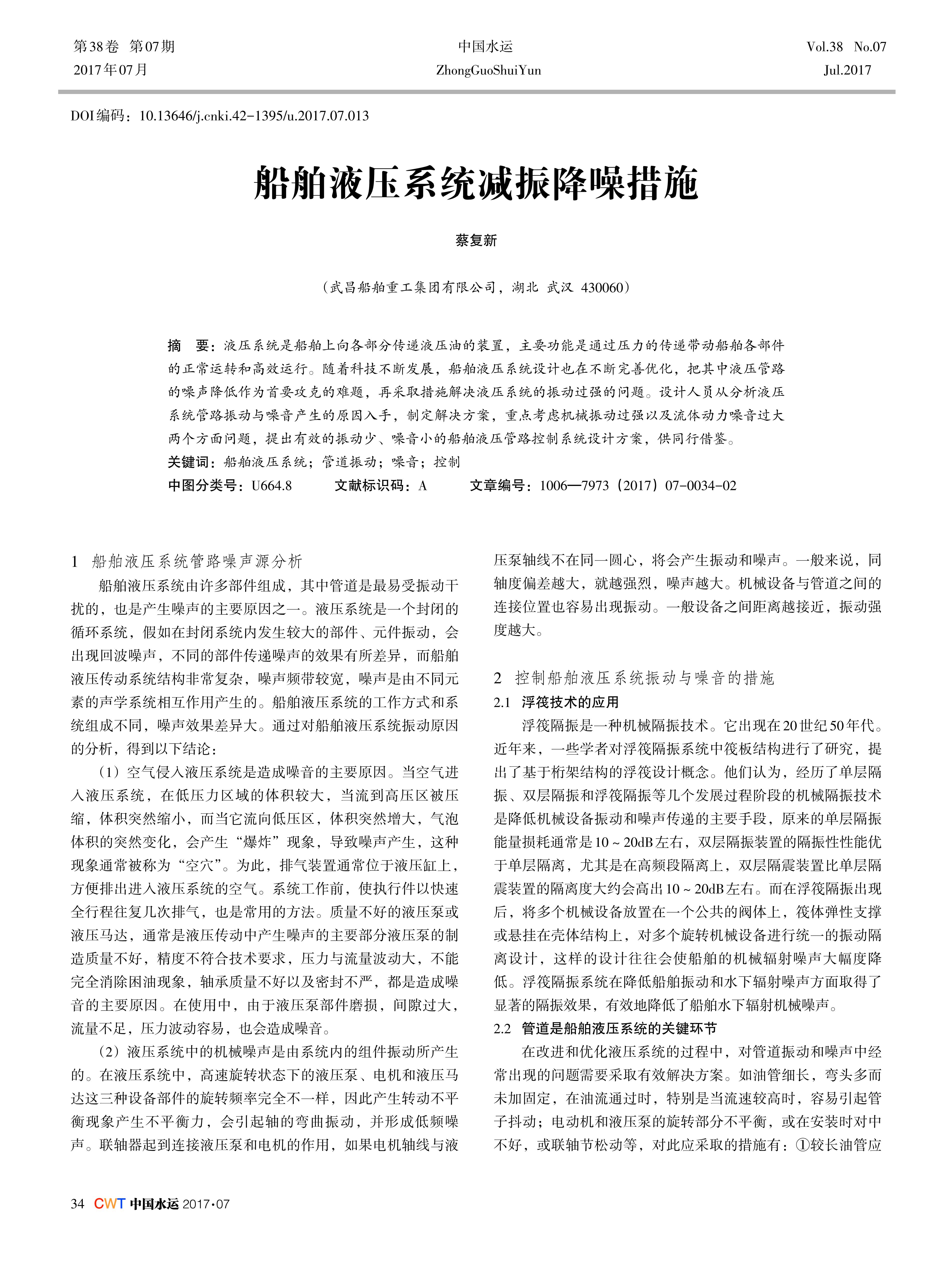 液压系统是船舶上向各部分传递液压油的装置,主要功能是通过压力的传递带动船舶各部件 的正常运转和高效运行。随着科技不断发展,船舶液压系统设计也在不断完善优化,把其中液压管路 的噪声降低作为首要攻克的难题,再采取措施解决液压系统的振动过强的问题。设计人员从分析液压 系统管路振动与噪音产生的原因入手,制定解决方案,重点考虑机械振动过强以及流体动力噪音过大 两个方面问题,提出有效的振动少、噪音小的船舶液压管路控制系统设计方案,供同行借鉴。