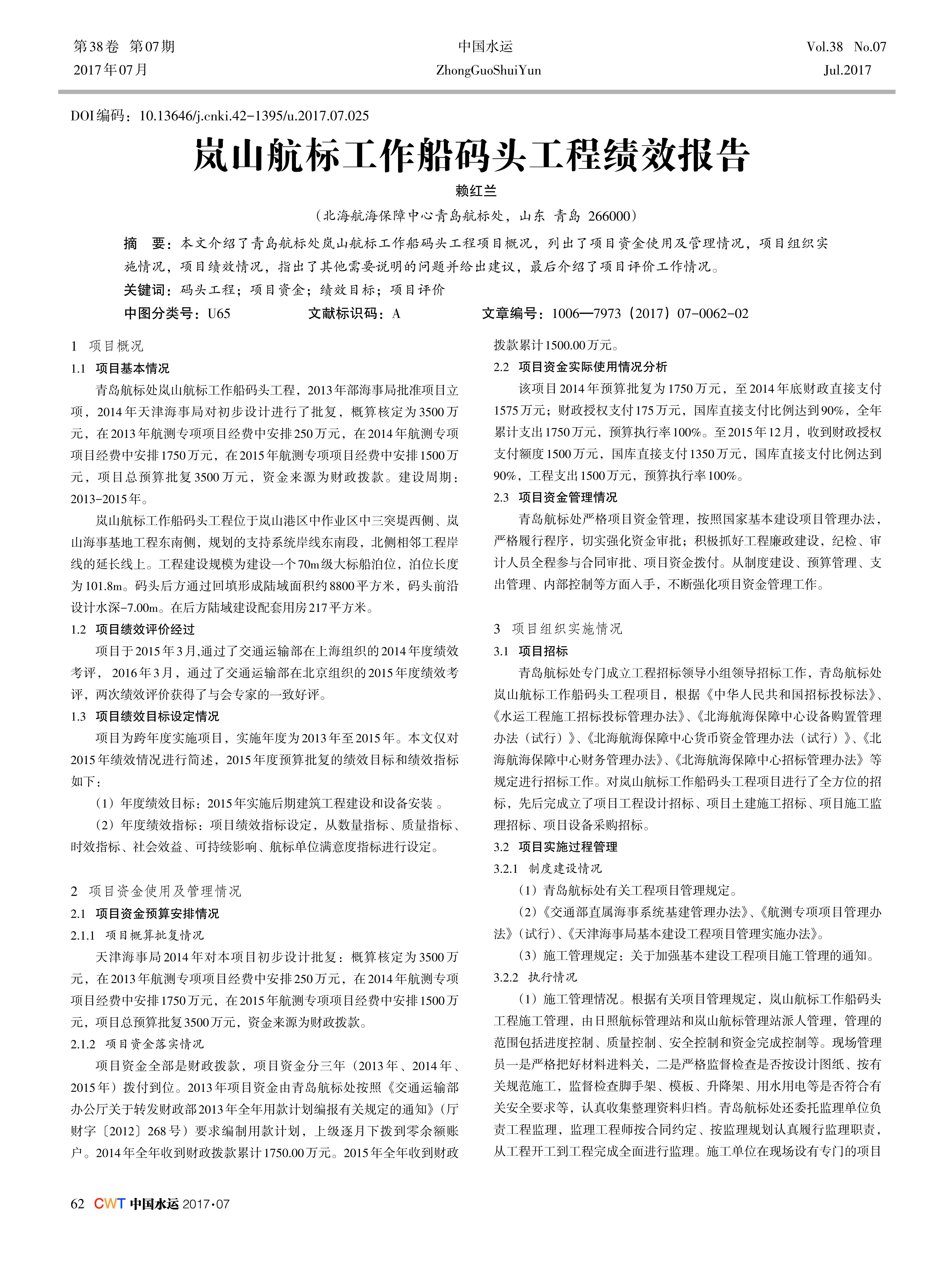 本文介绍了青岛航标处岚山航标工作船码头工程项目概况,列出了项目资金使用及管理情况,项目组织实 施情况,项目绩效情况,指出了其他需要说明的问题并给出建议,最后介绍了项目评价工作情况。