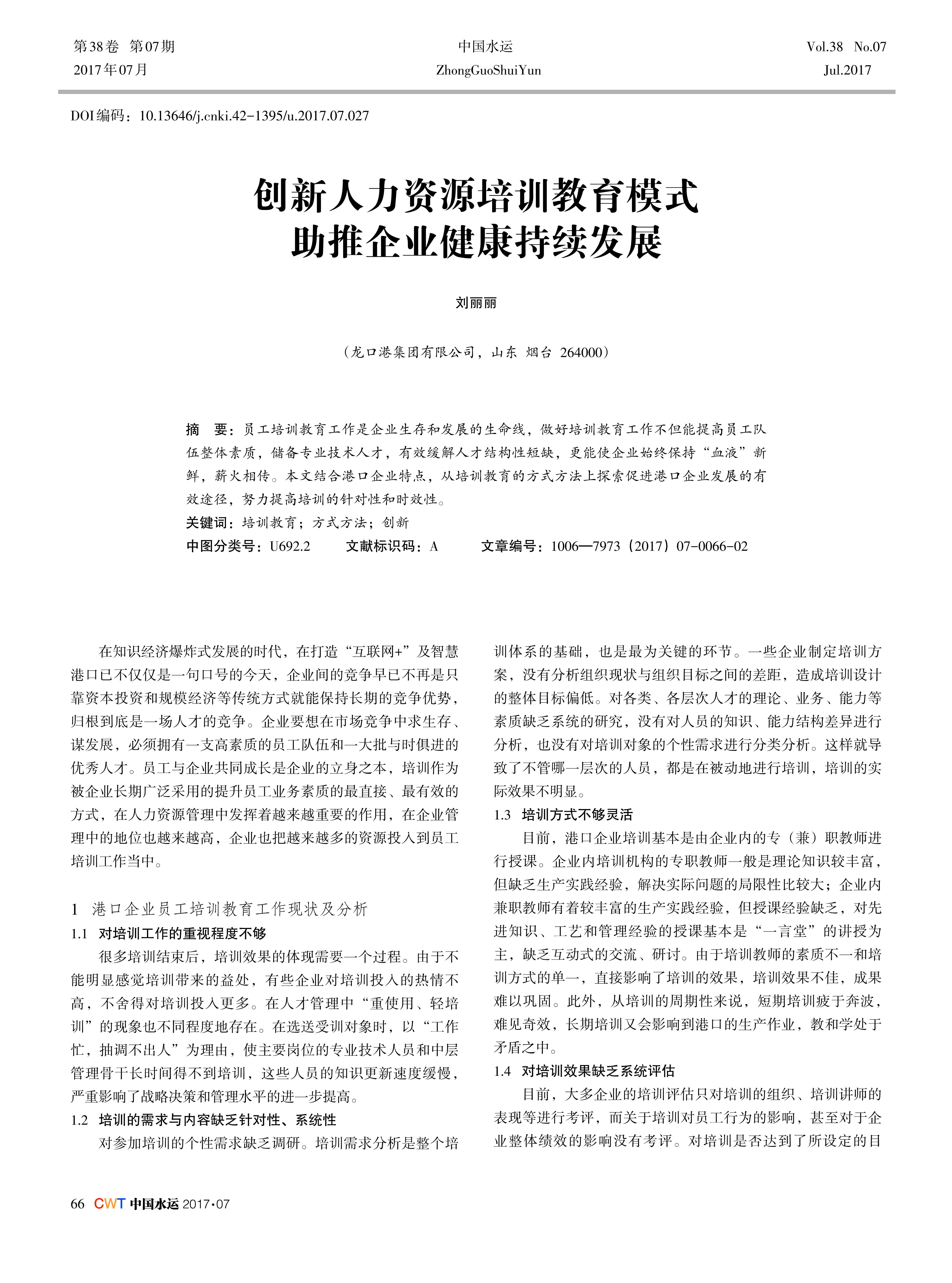 员工培训教育工作是企业生存和发展的生命线,做好培训教育工作不但能提高员工队 伍整体素质,储备专业技术人才,有效缓解人才结构性短缺,更能使企业始终保持“血液”新 鲜,薪火相传。本文结合港口企业特点,从培训教育的方式方法上探索促进港口企业发展的有 效途径,努力提高培训的针对性和时效性。