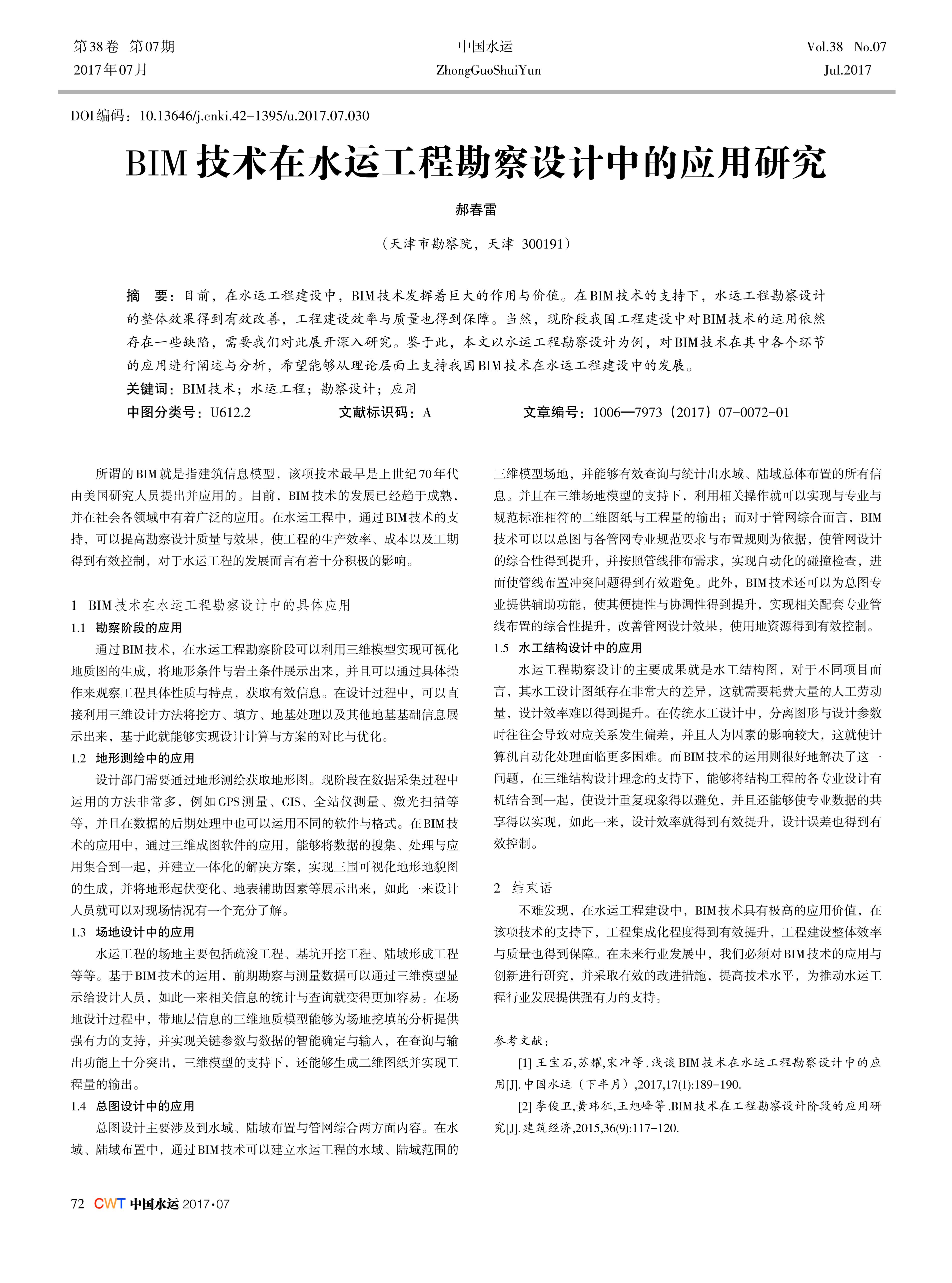 目前,在水运工程建设中,BIM技术发挥着巨大的作用与价值。在BIM技术的支持下,水运工程勘察设计 的整体效果得到有效改善,工程建设效率与质量也得到保障。当然,现阶段我国工程建设中对BIM技术的运用依然 存在一些缺陷,需要我们对此展开深入研究。鉴于此,本文以水运工程勘察设计为例,对BIM技术在其中各个环节 的应用进行阐述与分析,希望能够从理论层面上支持我国BIM技术在水运工程建设中的发展。