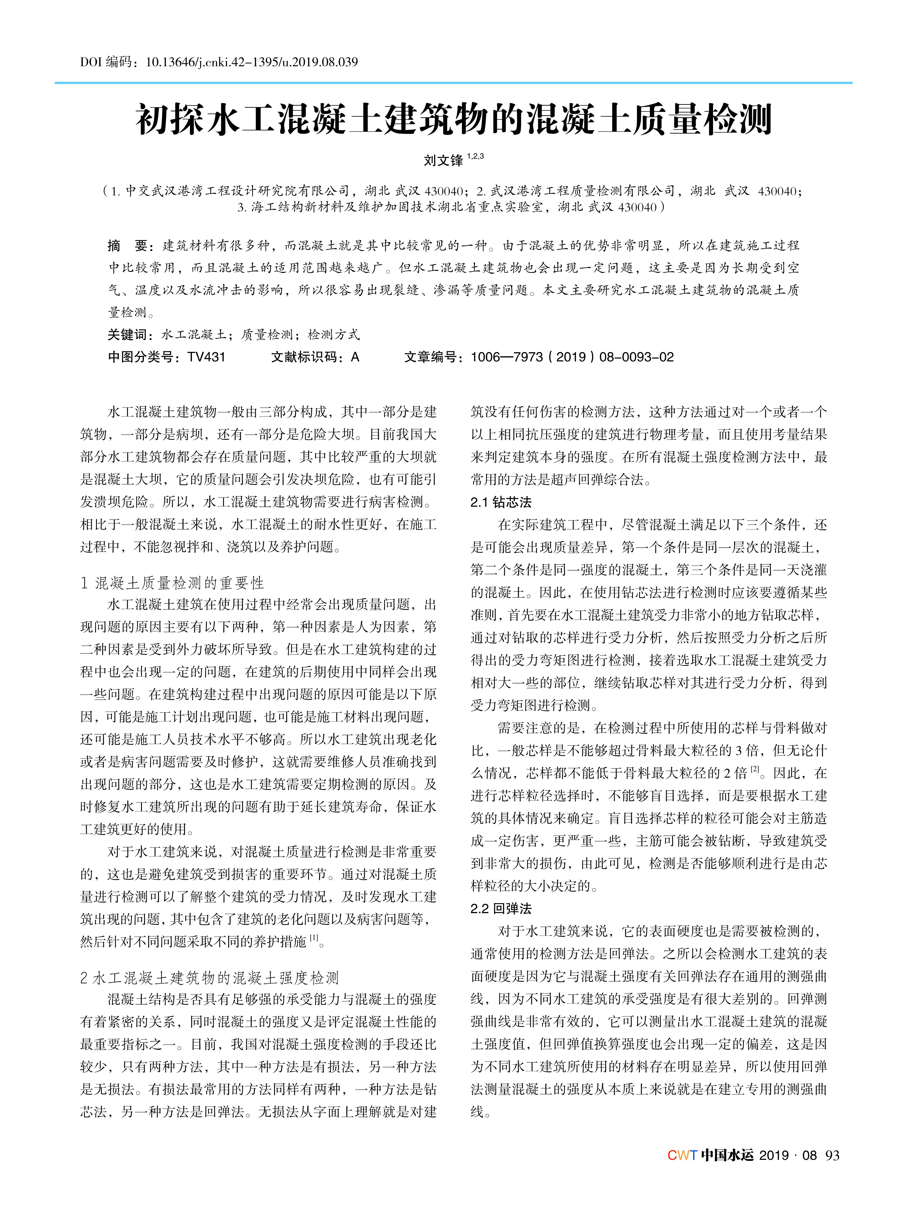 建筑材料有很多种,而混凝土就是其中比较常见的一种。由于混凝土的优势非常明显,所以在建筑施工过程 中比较常用,而且混凝土的适用范围越来越广。但水工混凝土建筑物也会出现一定问题,这主要是因为长期受到空 气、温度以及水流冲击的影响,所以很容易出现裂缝、渗漏等质量问题。本文主要研究水工混凝土建筑物的混凝土质 量检测。