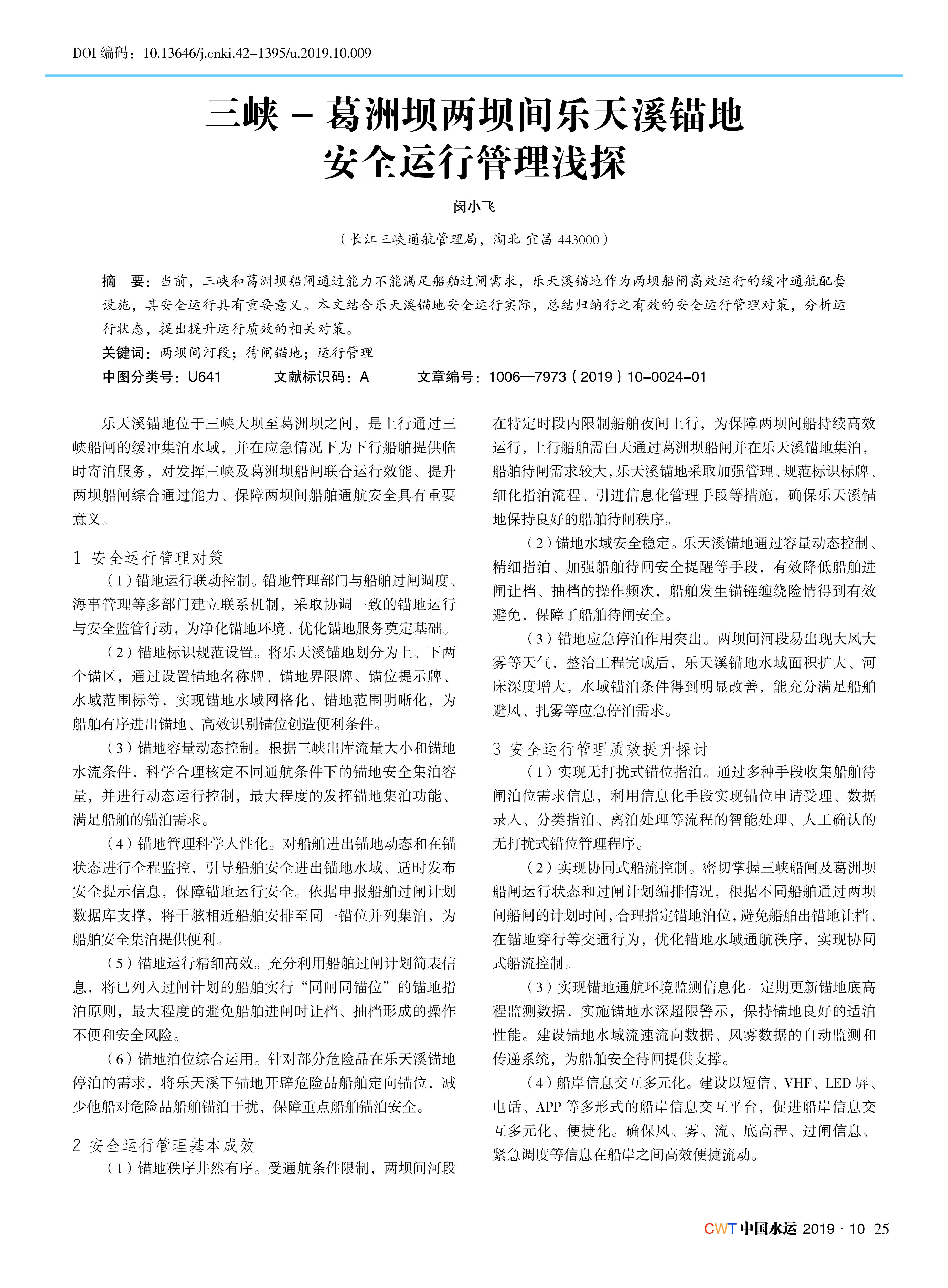 三峡 - 葛洲坝两坝间乐天溪锚地 安全运行管理浅探