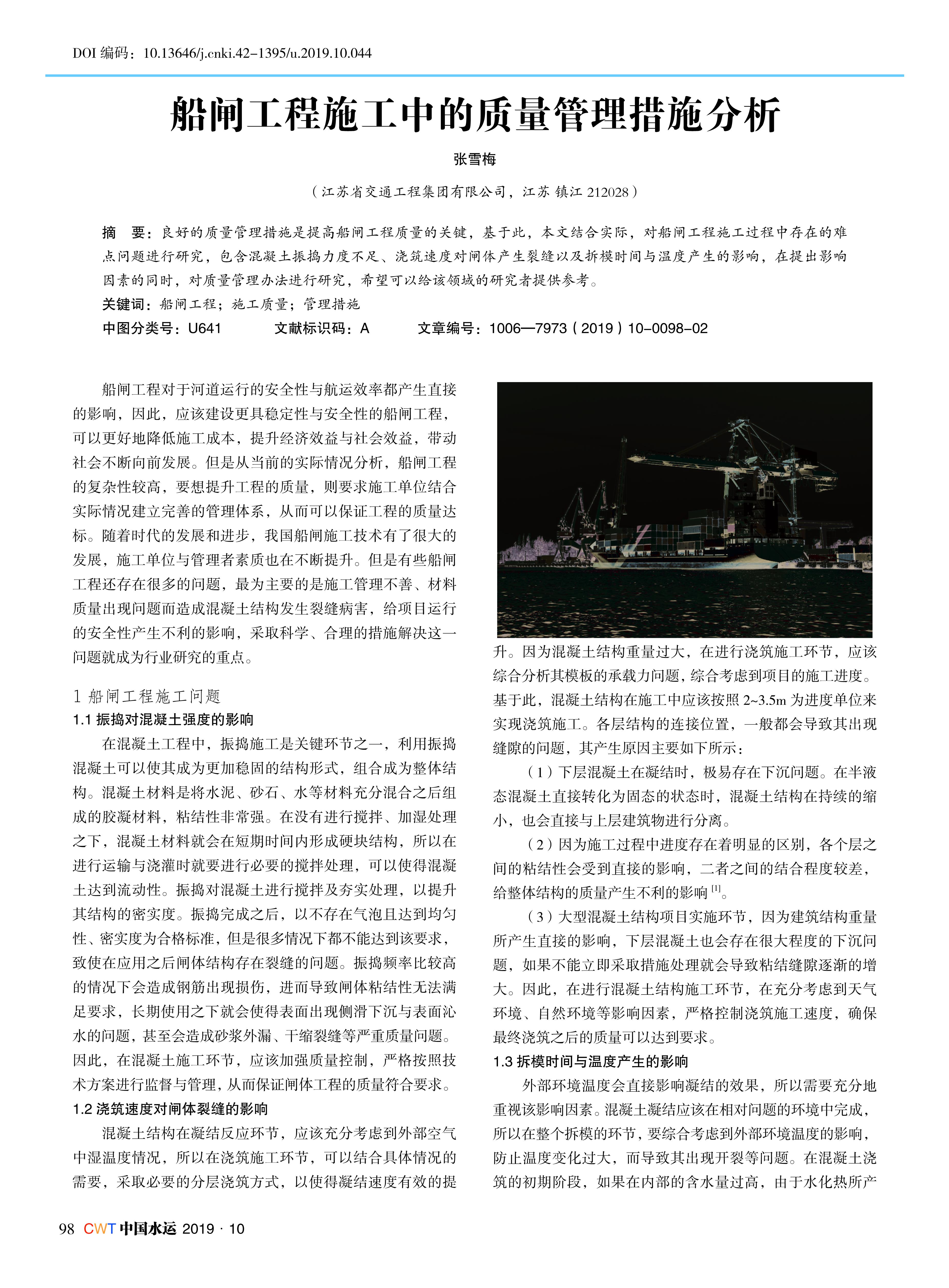 良好的质量管理措施是提高船闸工程质量的关键,基于此,本文结合实际,对船闸工程施工过程中存在的难 点问题进行研究,包含混凝土振捣力度不足、浇筑速度对闸体产生裂缝以及拆模时间与温度产生的影响,在提出影响 因素的同时,对质量管理办法进行研究,希望可以给该领域的研究者提供参考。