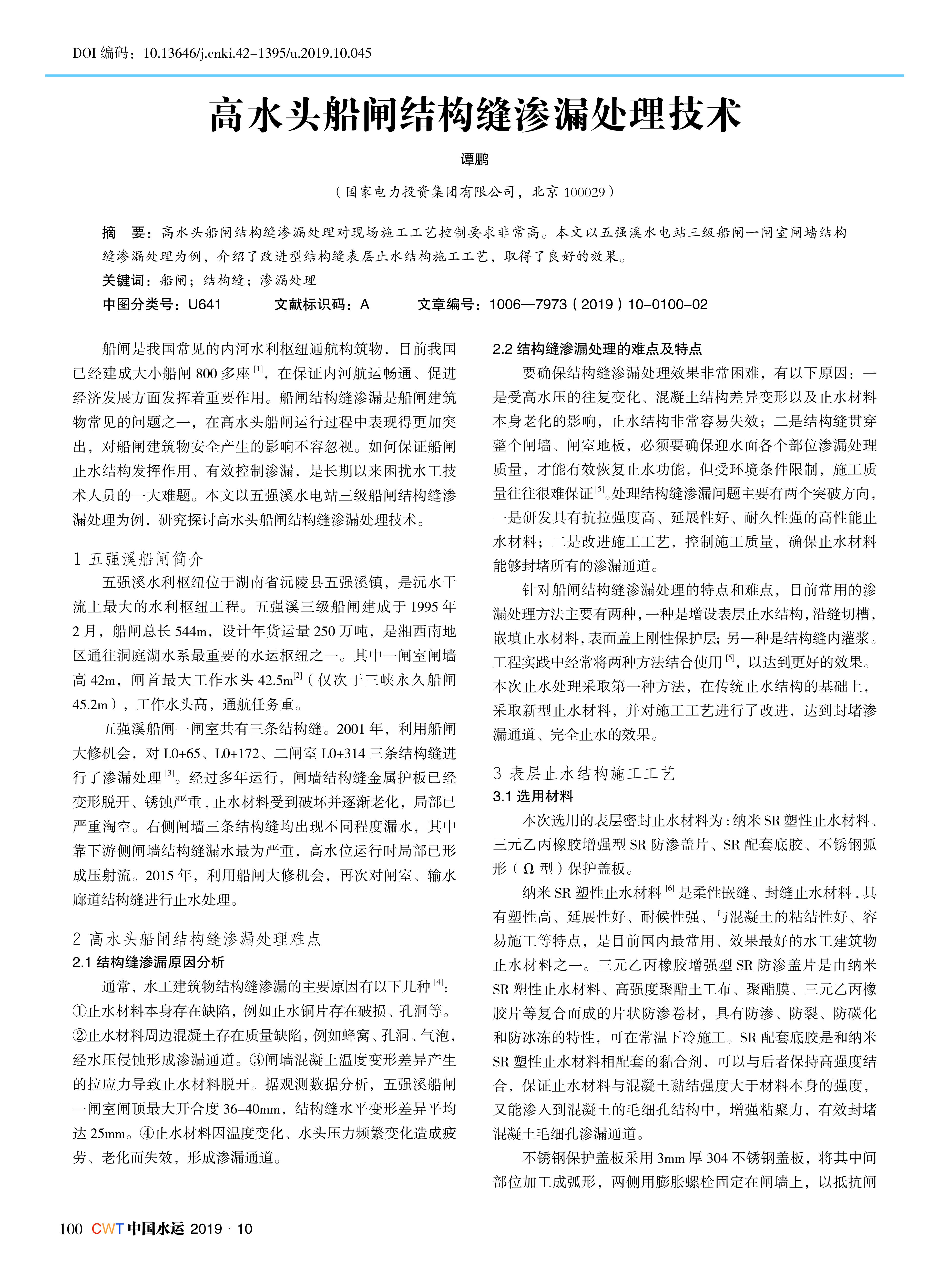 高水头船闸结构缝渗漏处理对现场施工工艺控制要求非常高。本文以五强溪水电站三级船闸一闸室闸墙结构 缝渗漏处理为例,介绍了改进型结构缝表层止水结构施工工艺,取得了良好的效果。