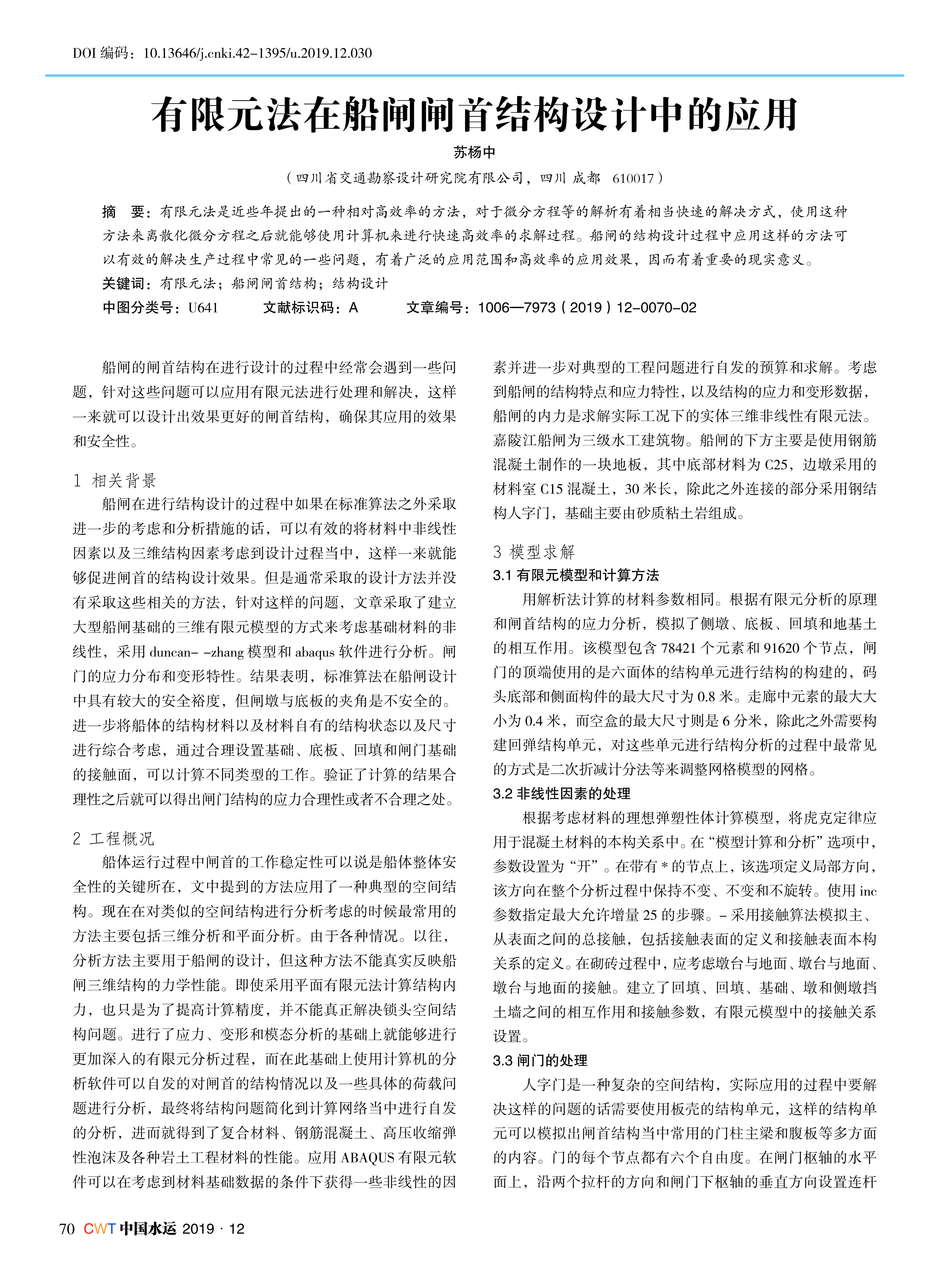 有限元法是近些年提出的一种相对高效率的方法,对于微分方程等的解析有着相当快速的解决方式,使用这种 方法来离散化微分方程之后就能够使用计算机来进行快速高效率的求解过程。船闸的结构设计过程中应用这样的方法可 以有效的解决生产过程中常见的一些问题,有着广泛的应用范围和高效率的应用效果,因而有着重要的现实意义。