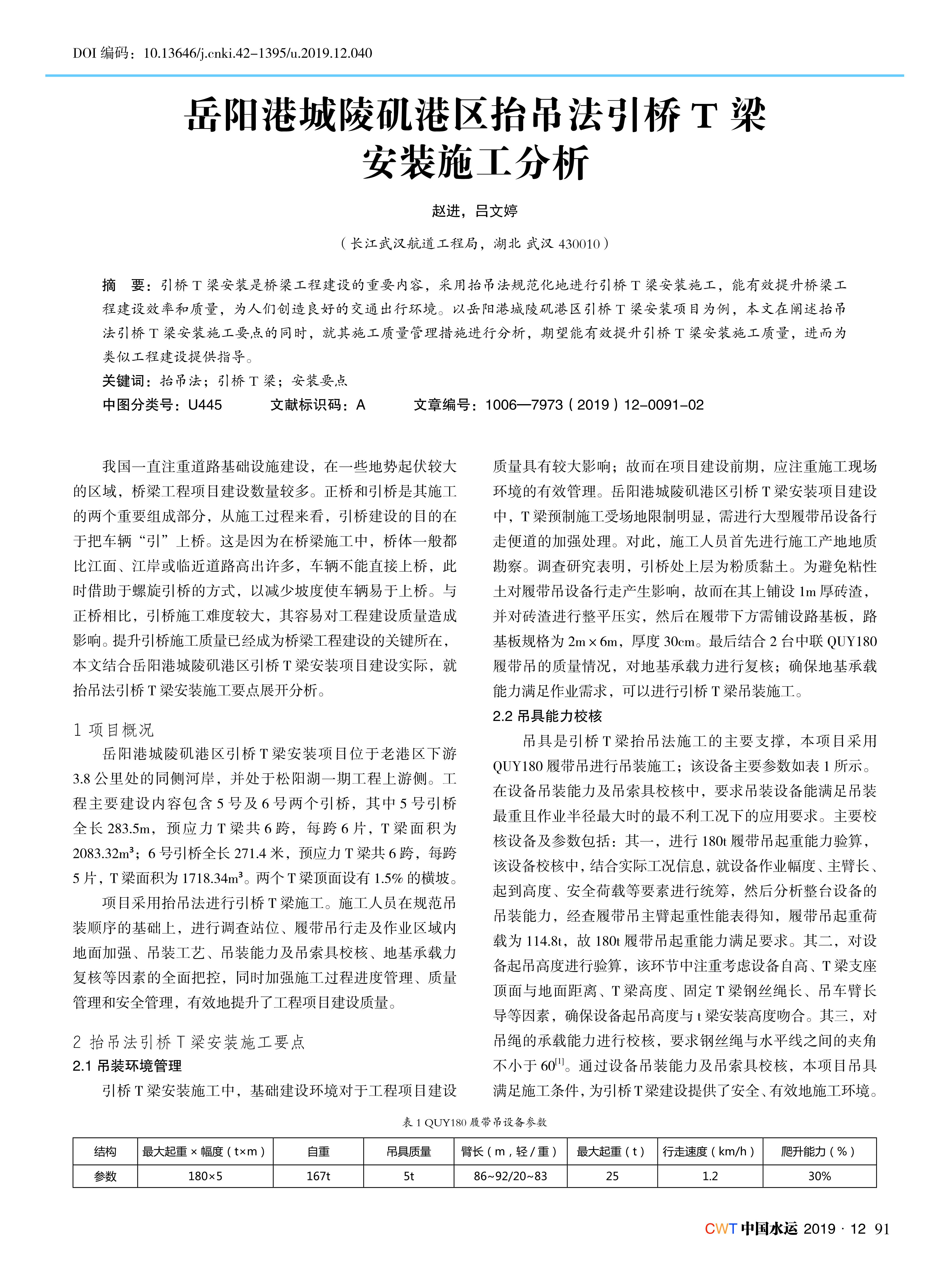 引桥 T 梁安装是桥梁工程建设的重要内容,采用抬吊法规范化地进行引桥 T 梁安装施工,能有效提升桥梁工 程建设效率和质量,为人们创造良好的交通出行环境。以岳阳港城陵矶港区引桥 T 梁安装项目为例,本文在阐述抬吊 法引桥 T 梁安装施工要点的同时,就其施工质量管理措施进行分析,期望能有效提升引桥 T 梁安装施工质量,进而为 类似工程建设提供指导。