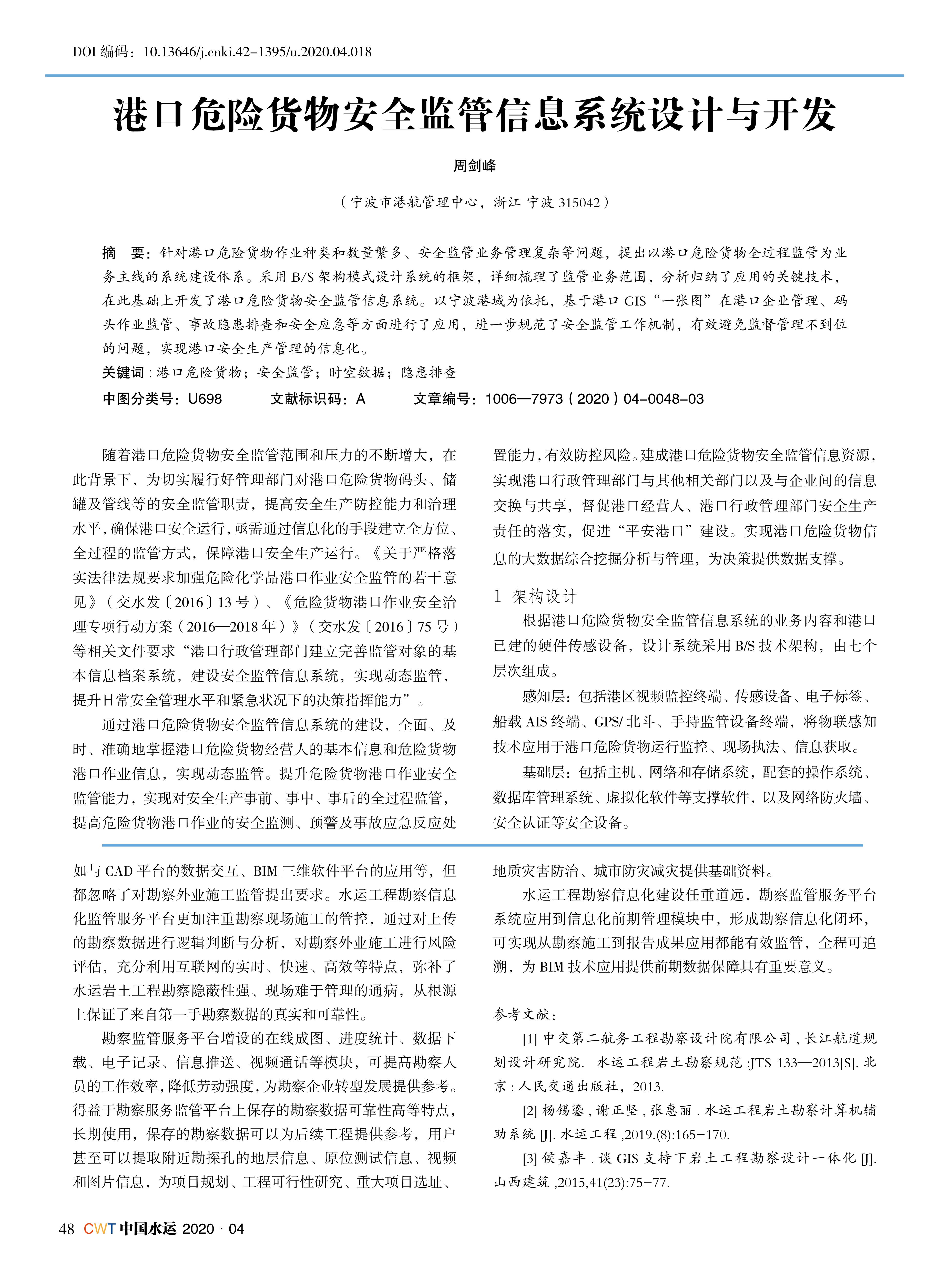 针对港口危险货物作业种类和数量繁多、安全监管业务管理复杂等问题,提出以港口危险货物全过程监管为业 务主线的系统建设体系。采用 B/S 架构模式设计系统的框架,详细梳理了监管业务范围,分析归纳了应用的关键技术, 在此基础上开发了港口危险货物安全监管信息系统。以宁波港域为依托,基于港口 GIS“一张图”在港口企业管理、码 头作业监管、事故隐患排查和安全应急等方面进行了应用,进一步规范了安全监管工作机制,有效避免监督管理不到位 的问题,实现港口安全生产管理的信息化。