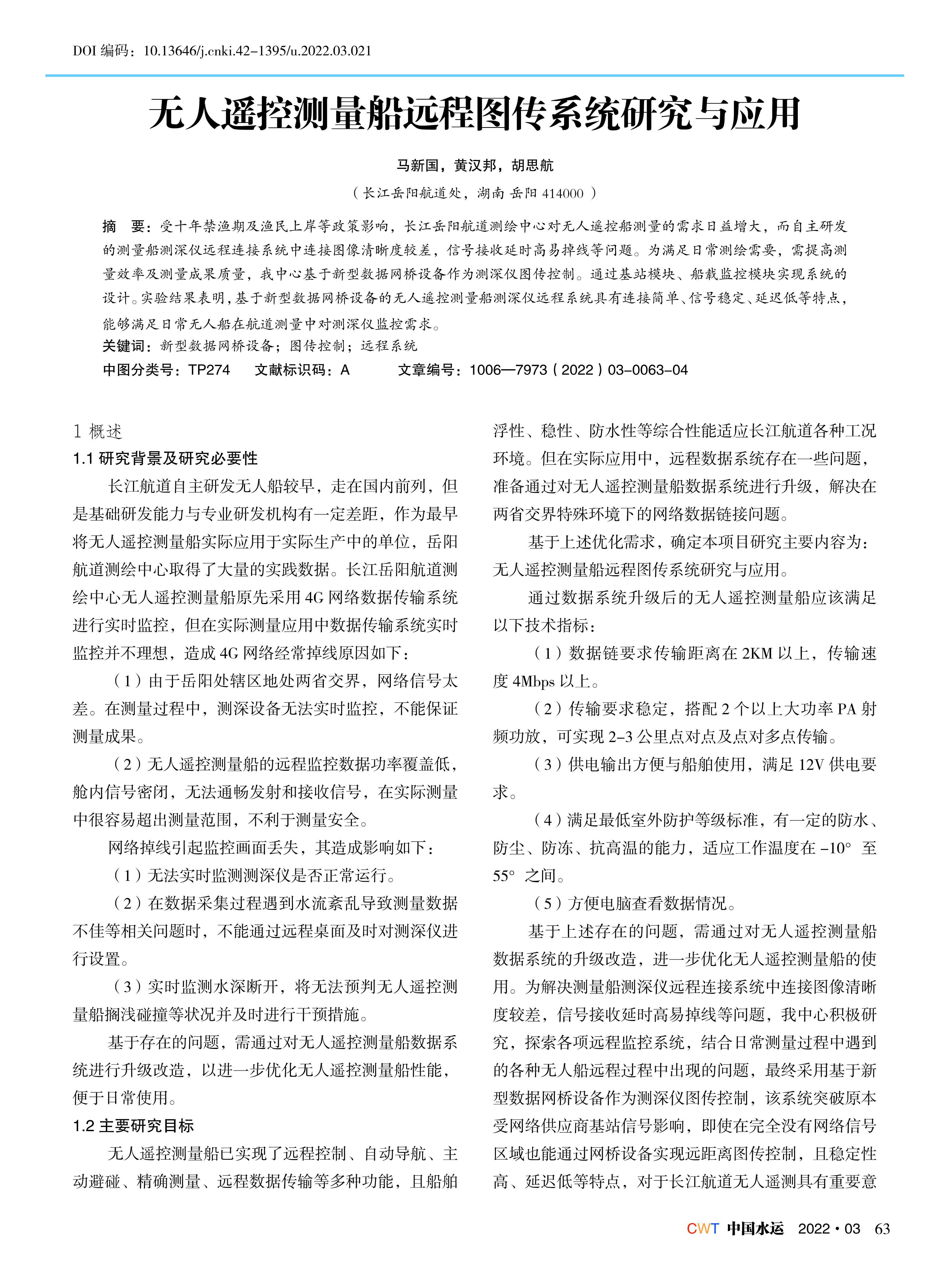 无人遥控测量船远程图传系统研究与应用