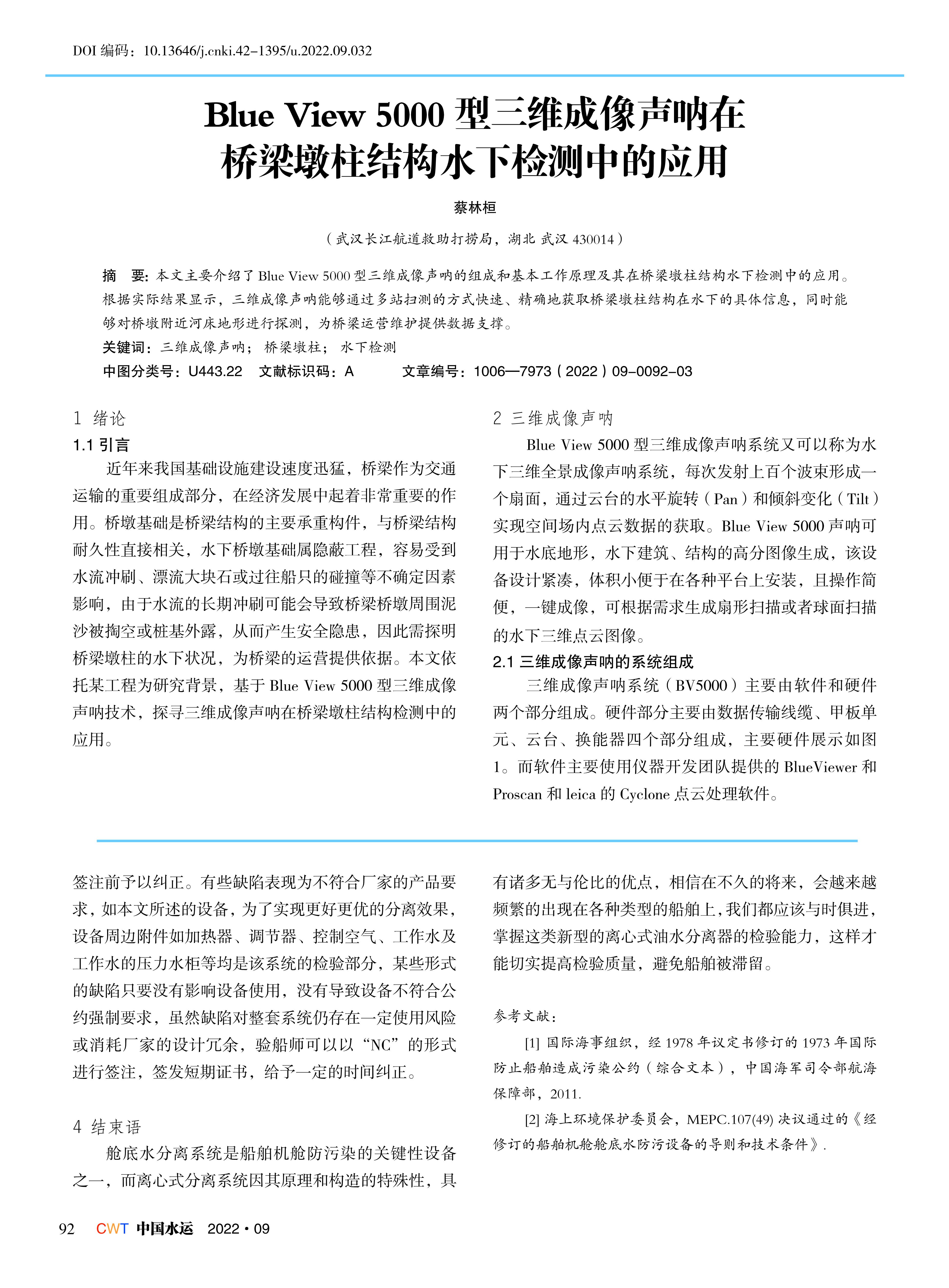 Blue View 5000 型三维成像声呐在桥梁墩柱结构水下检测中的应用