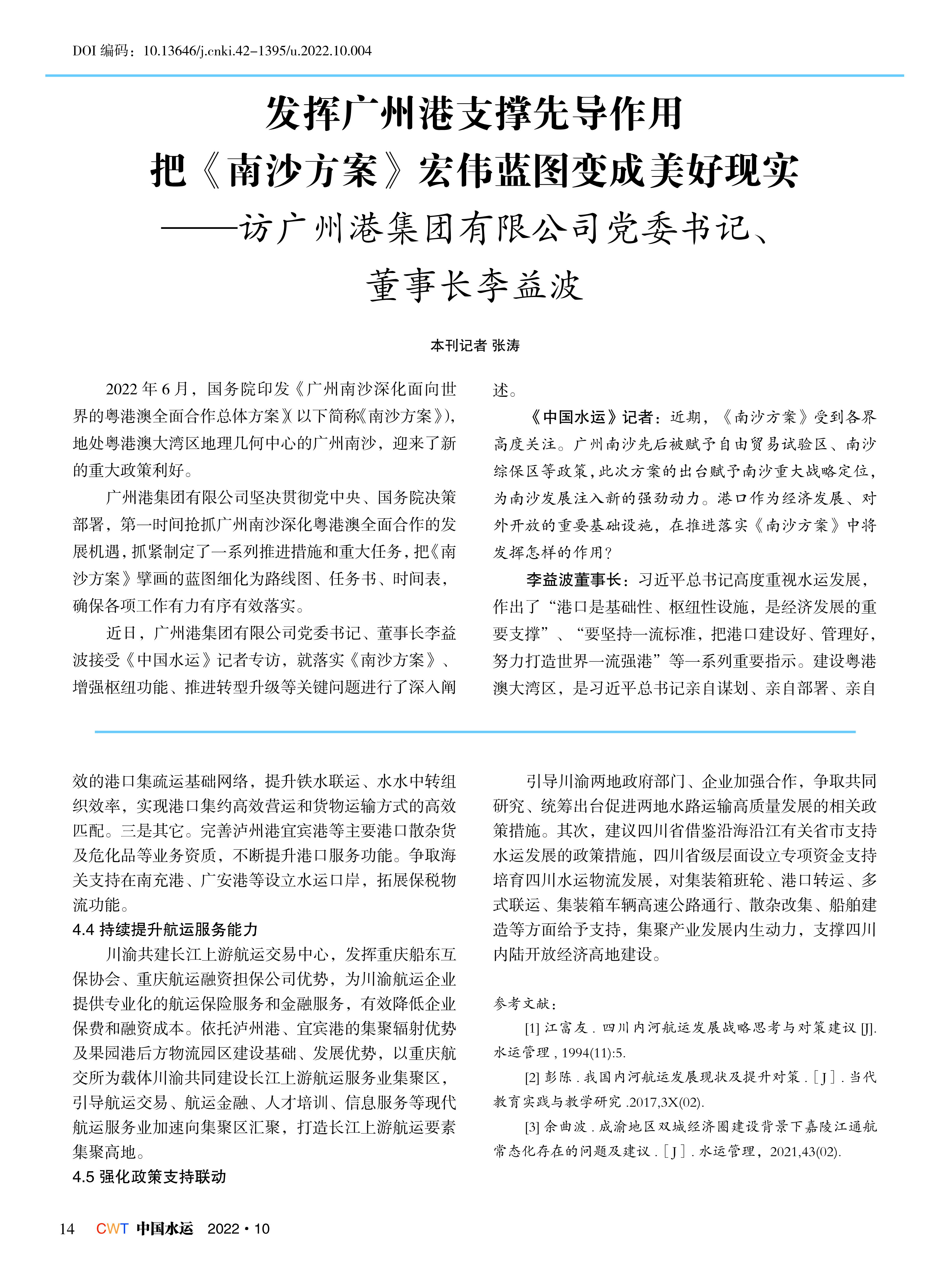 发挥广州港支撑先导作用 把《南沙方案》宏伟蓝图变成美好现实——访广州港集团有限公司党委书记、董事长李益波