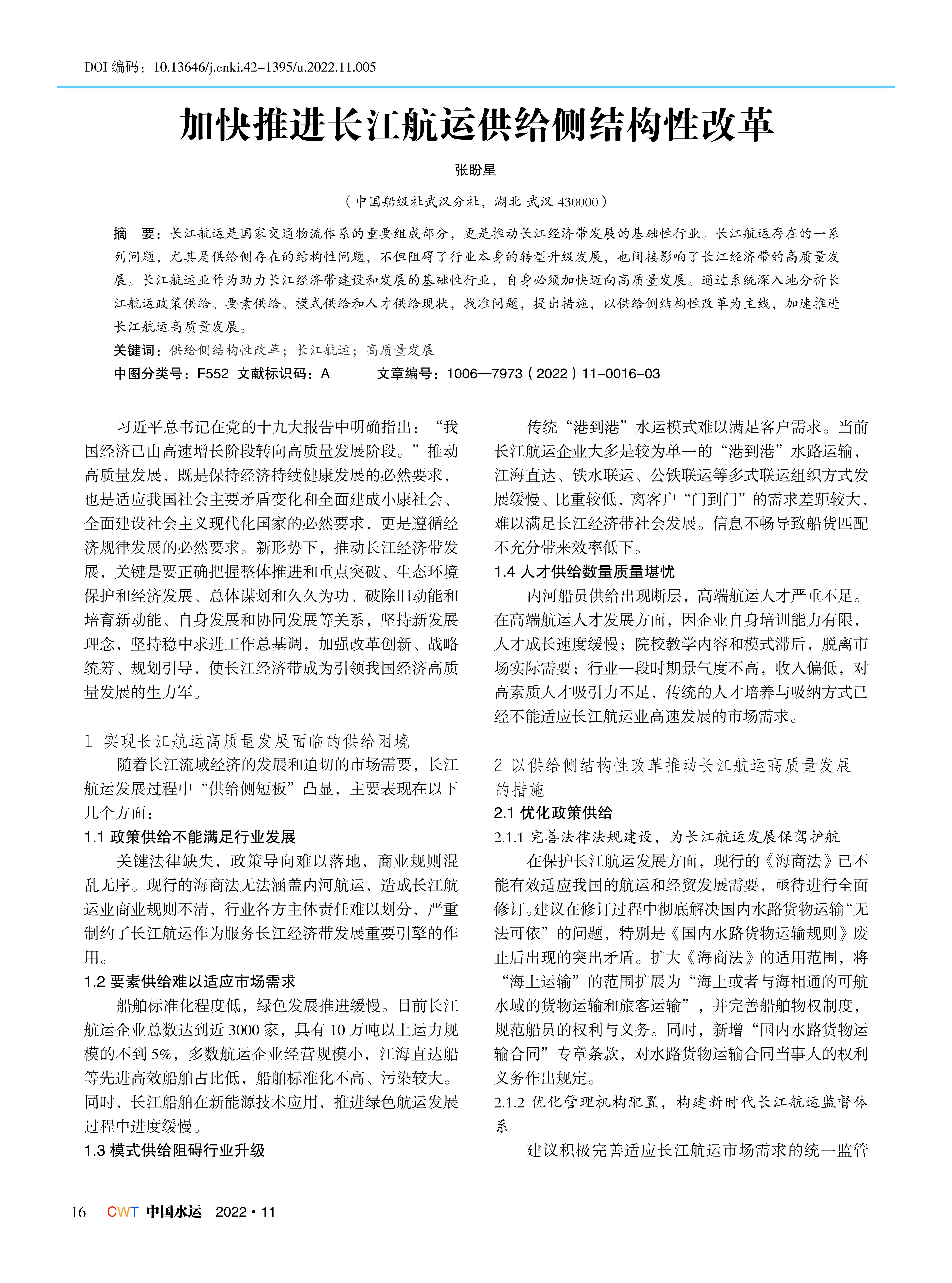 加快推进长江航运供给侧结构性改革