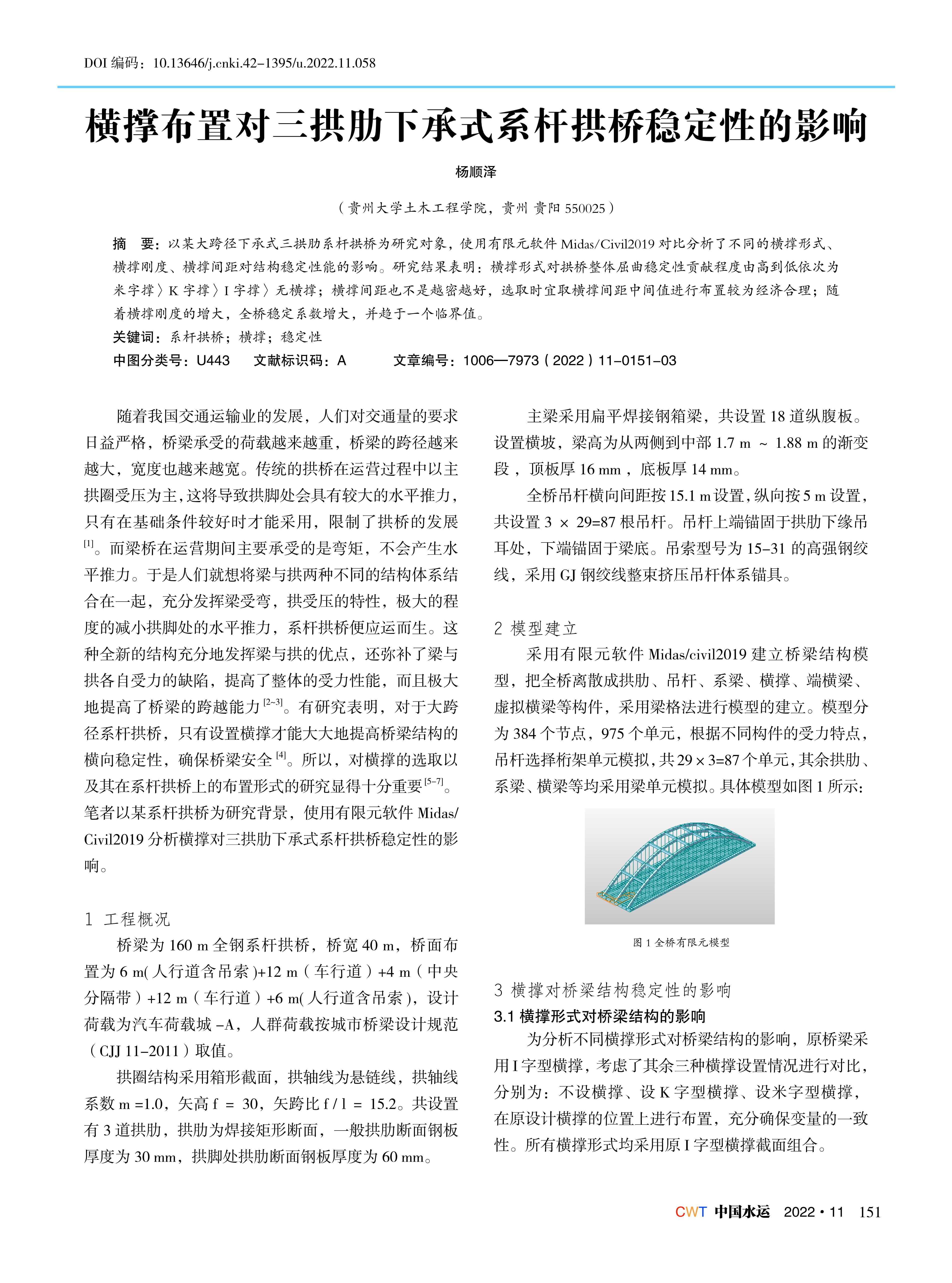 横撑布置对三拱肋下承式系杆拱桥稳定性的影响