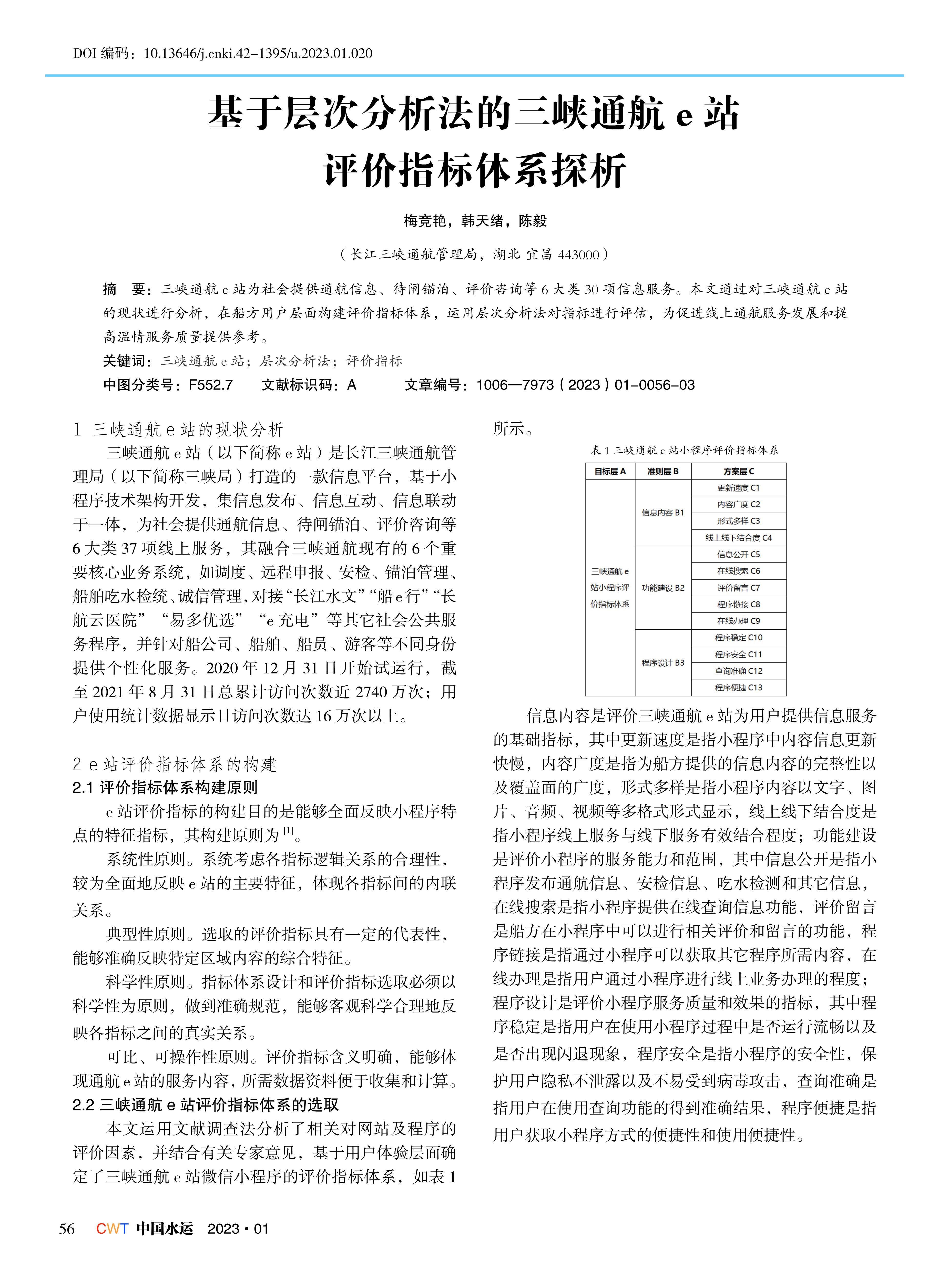 基于层次分析法的三峡通航e站评价指标体系探析