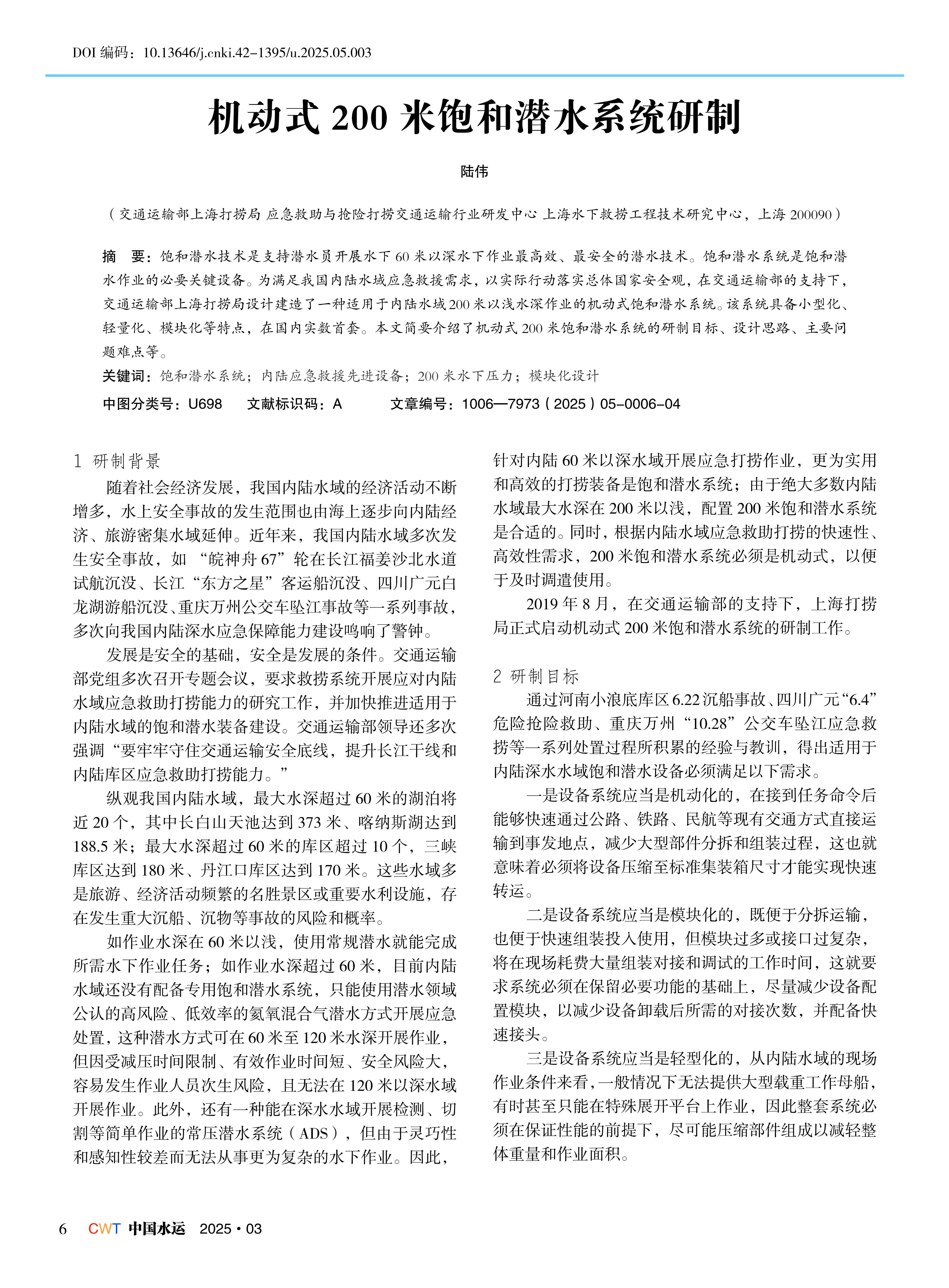 机动式 200 米饱和潜水系统研制