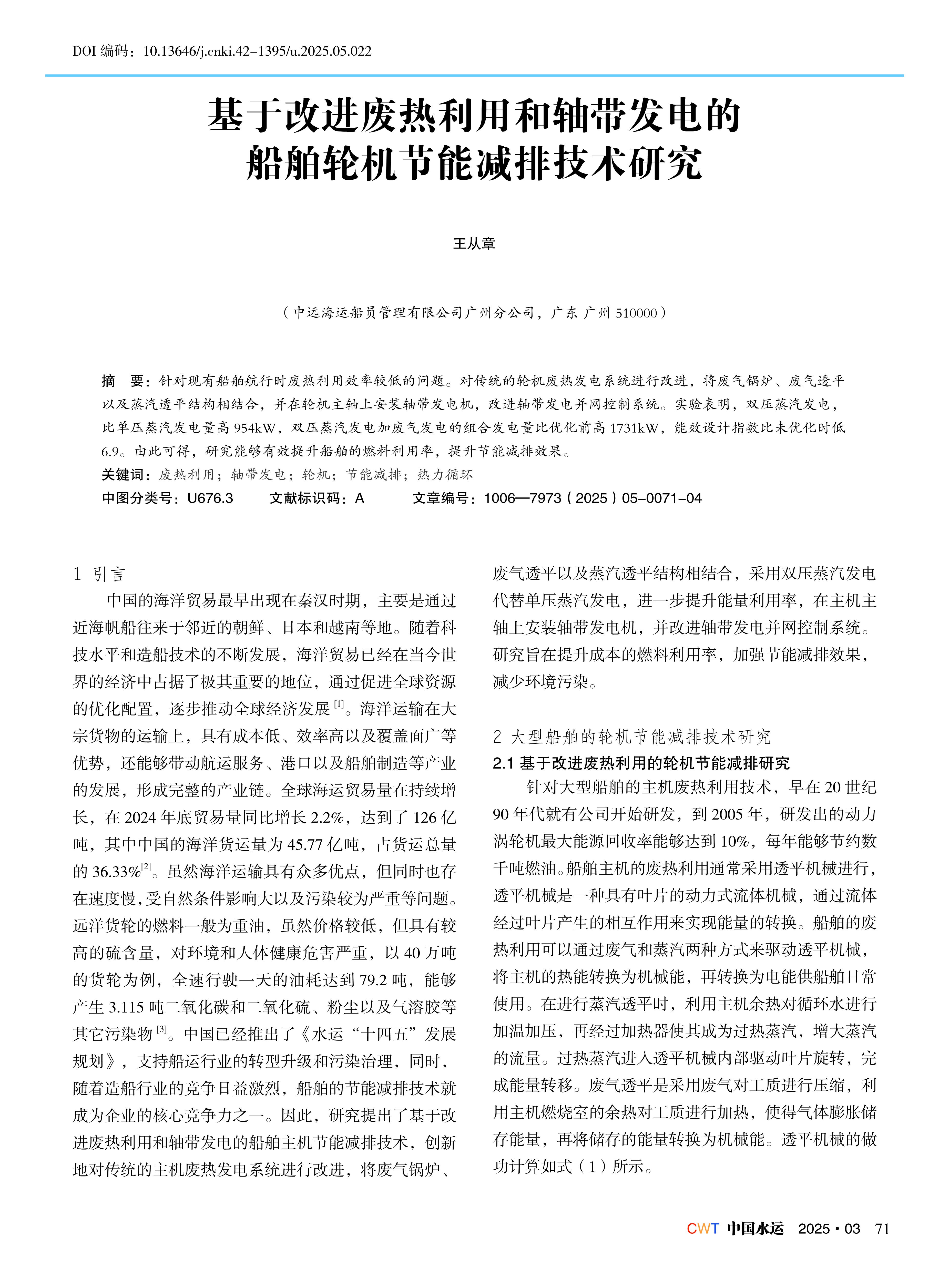 基于改进废热利用和轴带发电的船舶轮机节能减排技术研究